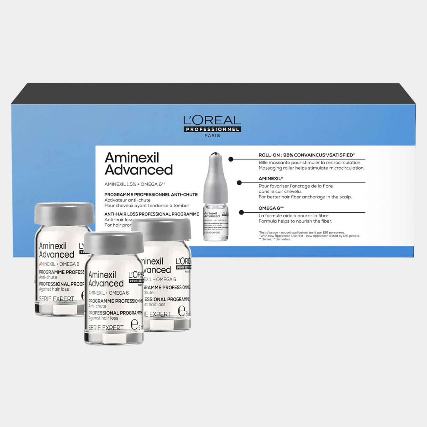 El Aminexil fortalece el anclaje de la fibra en el cuero cabelludo y estimula la actividad de la raíz.. El Omega 6 actúa sobre la raíz para estimular su actividad, además es un elemento constitutivo del cabello que favorece la construcción de la fibra.